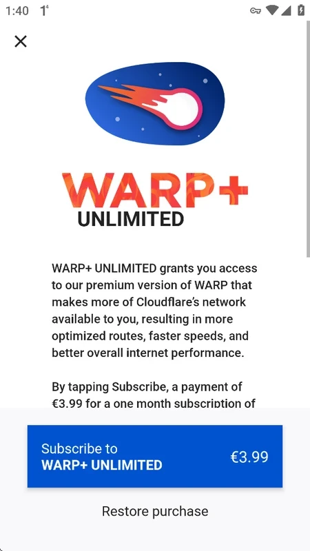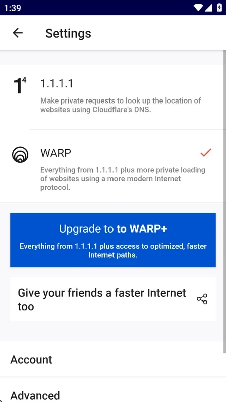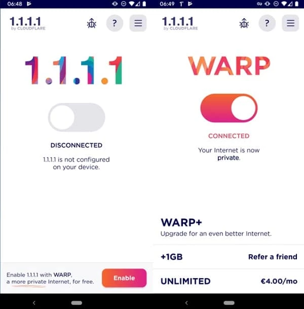 يمكنك استخدام خدمات DNS وWRAP مجانًا مع جميع الميزات الأساسية. كما يمكنك الترقية إلى WRAP+ للاستفادة من نطاق ترددي فائق عبر شبكة Argo التابعة لـ Cloudflare، حيث توفر مسارات خالية من الازدحام، وسرعة فائقة تصل إلى 30%، وغيرها من المزايا. يتطلب الاشتراك دفع رسوم شهرية عبر متجر Google Play .